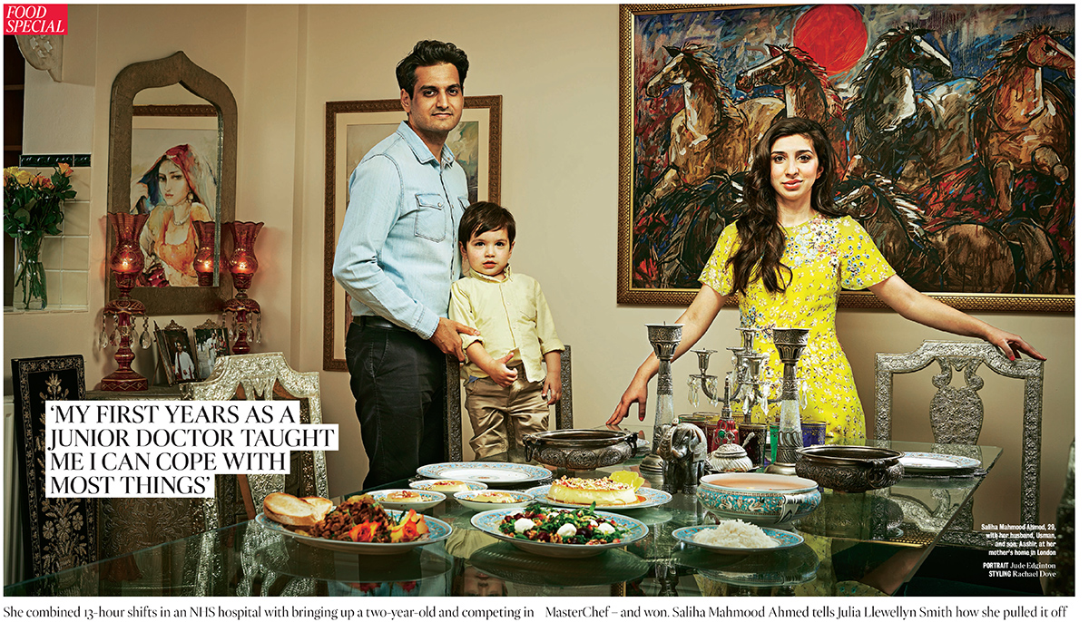 She combined 13-hour shifts in an NHS hospital with bringing up a two-year-old and competing in MasterChef – and won. Jude travelled to Saliha’s family home to take this portrait of her with her husband, son and a few of her winning dishes.